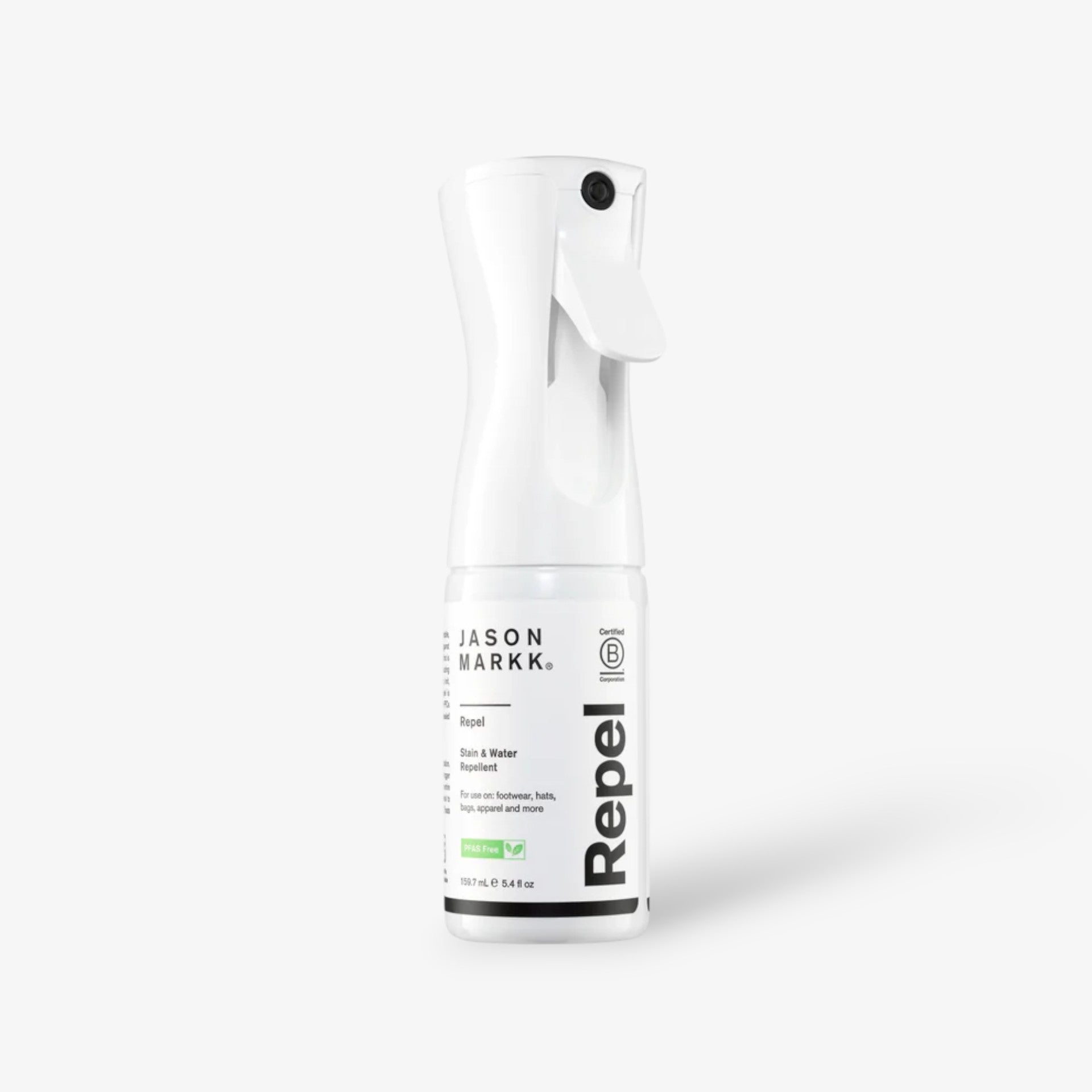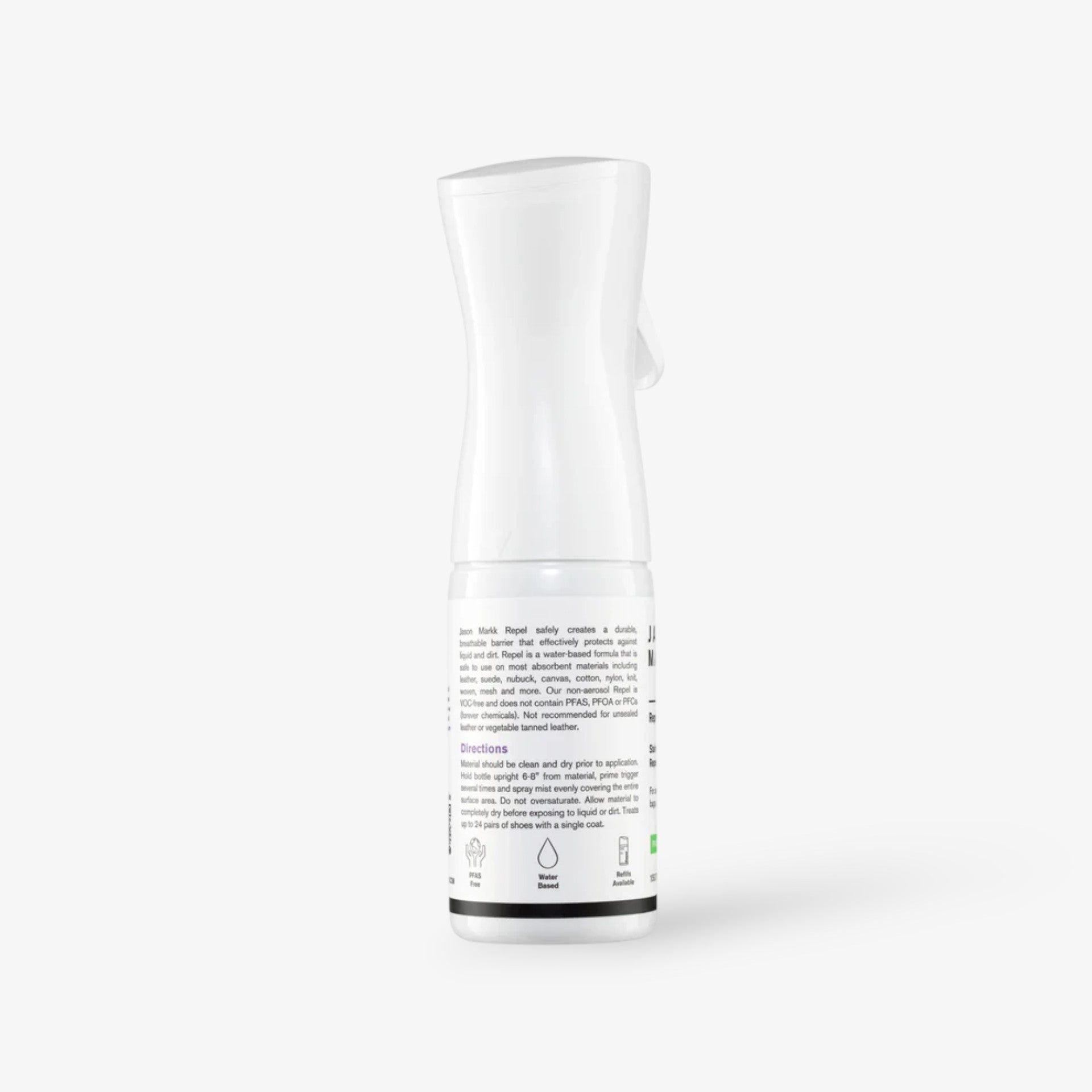 Our water-based Repel formula is VOC-free and does not contain PFAS, PFOA or PFCs (forever chemicals). It safely creates a durable, breathable barrier that dries clear and effectively protects against liquid and dirt. Repel is safe to use on most absorbent materials including leather, suede, nubuck, canvas, cotton, nylon, knit, woven, mesh and more (Not recommended for unsealed leather or vegetable tanned leather). The non-aerosol delivery system outputs a continuous fine mist covering large areas quickly and evenly in all directions.